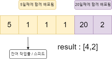 2. 배포 날짜를 나열했을 때, 뒷 요소가 앞 요소보다 작을 경우 앞 요소보다 빨리 배포되지 않고 앞 요소가 배포될때 함께 배포됨. -> 앞 요소(기준) ~ 앞 요소보다 작거나 같은 요소들까지 함께 배포됨.